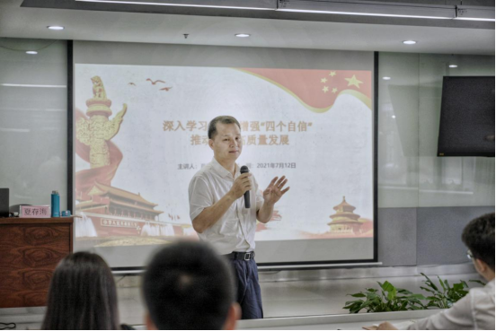 夏存海以《深入學(xué)習(xí)黨史 增強(qiáng)“四個(gè)自信” 推動(dòng)企業(yè)高質(zhì)量發(fā)展》為主題,用通俗易懂的語言、詳實(shí)具體的歷史事件回顧了中國(guó)共產(chǎn)黨波瀾壯闊的百年歷史,對(duì)“為什么要堅(jiān)定中國(guó)特色社會(huì)主義道路自信、理論自信、制度自信、文化自信”進(jìn)行了深入透徹的剖析和解讀。