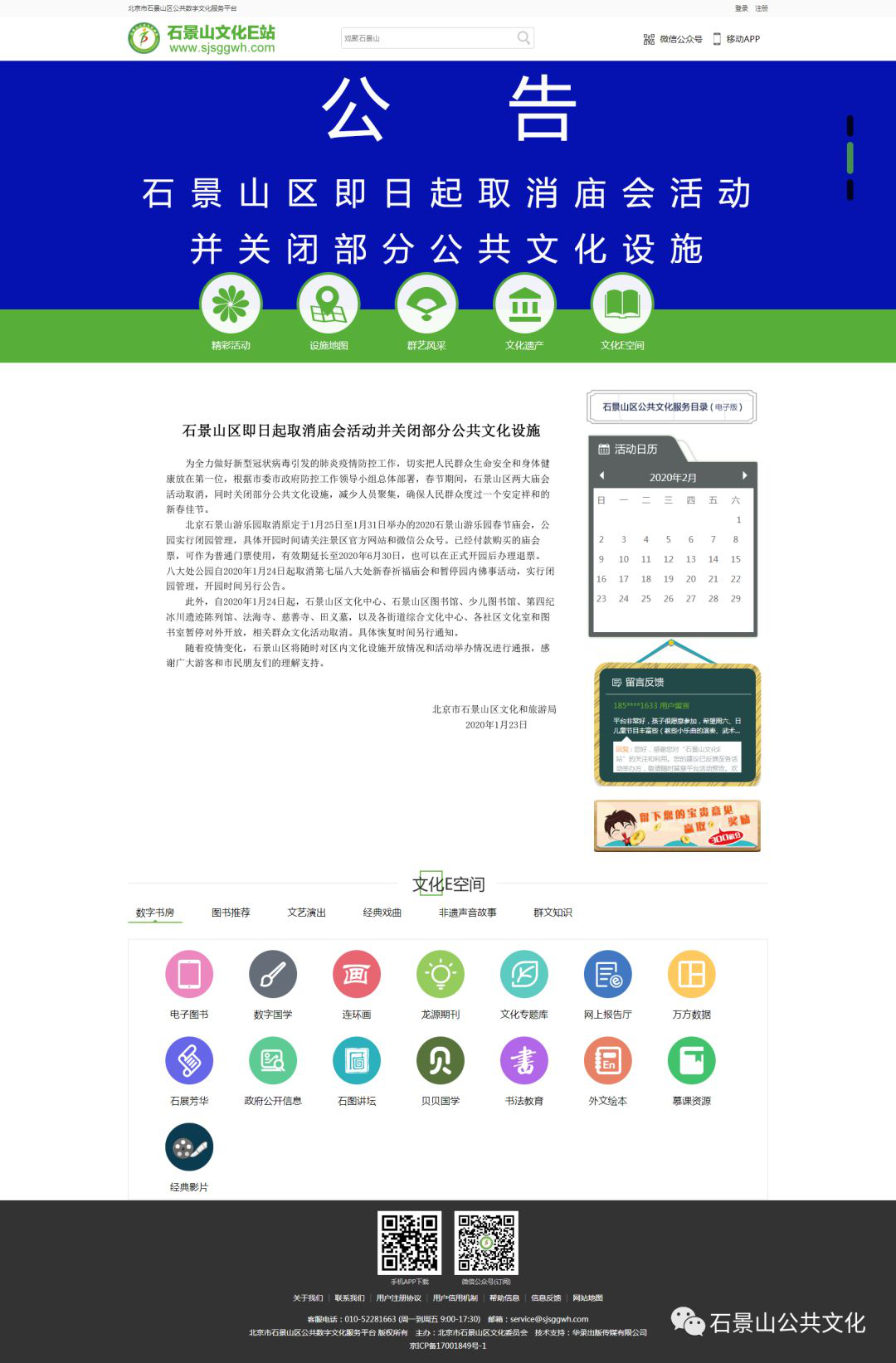 疫情發(fā)生以來(lái),北京市石景山區(qū)公共數(shù)字文化服務(wù)平臺(tái)在第一時(shí)間通過(guò)網(wǎng)站、手機(jī)APP、微信公眾號(hào)等渠道及時(shí)發(fā)布通知公告,關(guān)閉區(qū)、街、社區(qū)三級(jí)公共文化設(shè)施場(chǎng)館、文物保護(hù)單位、旅游景區(qū)及所有文化娛樂(lè)場(chǎng)所,停止舉辦集中性文化活動(dòng)。