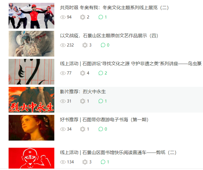 通過(guò)“石景山公共文化”微信公眾號(hào)發(fā)布抗擊疫情文化內(nèi)容,系列主題板塊如下:
