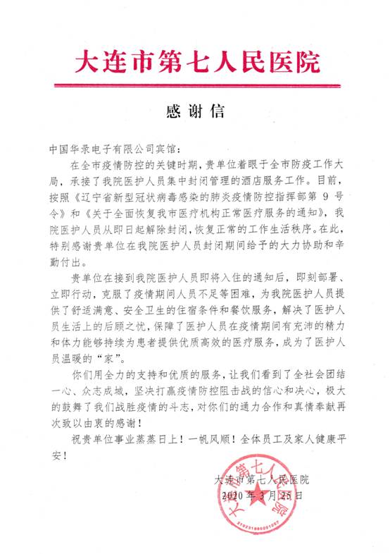 在舉國上下共同抗擊新冠疫情的非常時期,華錄集團堅決落實疫情防控部門部署,認真履行央企政治責任、社會責任,全力為一線醫(yī)護人員做好服務保障工作,圓滿完成了大連市疫情防控指揮部下達的服務保障任務。