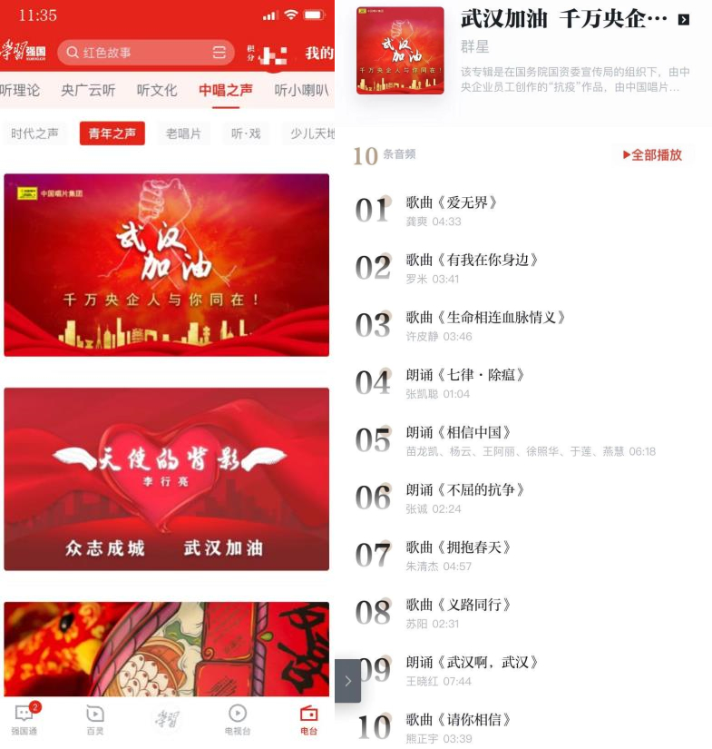 為了號召廣大央企人積極投身這場“抗疫”狙擊戰(zhàn),記錄并抒懷央企平凡英雄們的心聲,國務院國資委宣傳局組織了本次“中央企業(yè)戰(zhàn)疫歌曲征集活動”。中國華錄集團旗下中國唱片集團積極承擔文化央企使命,從各中央企業(yè)報送的231首作品中精選編輯,策劃制作了《武漢加油,千萬央企人與你同在!》央企抗疫作品精選集,并在第一時間上線中宣部學習強國平臺。