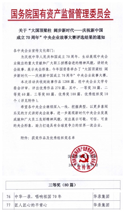 近日,由國務(wù)院國資委舉辦的“大國頂梁柱 闊步新時代,慶祝新中國成立70周年”中央企業(yè)故事大賽評選結(jié)果揭曉。由集團(tuán)公司選送的《中華一錄 唱響祖國“70”年》和《匠人匠心的平常心》獲本次故事大賽三等獎?!吨腥A一錄 唱響祖國“70”年》一文講述了中國華錄用音樂講好中國故事、做好民族文化傳承、傳播優(yōu)秀中國文化的情懷;《匠人匠心的平常心》記錄了技能大師馬瑾超三十年兢兢業(yè)業(yè),用心做好一件事的工匠精神。