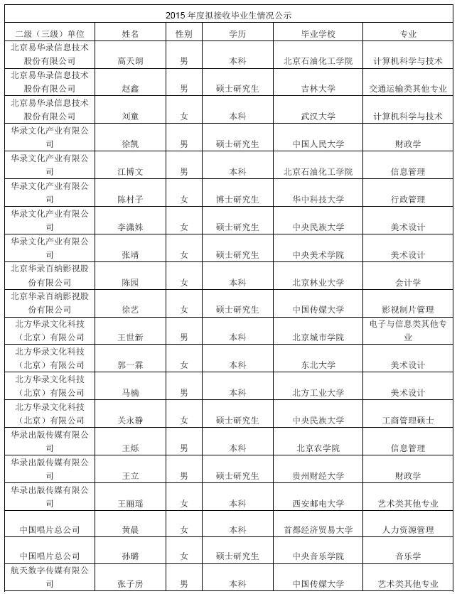 為確保中國華錄集團有限公司在京單位高校畢業(yè)生接收工作規(guī)范有序開展,現(xiàn)將在京單位提交的高校畢業(yè)生接收情況發(fā)布公示,接受社會監(jiān)督。公示期2015年9月28日-2015年10月12日。