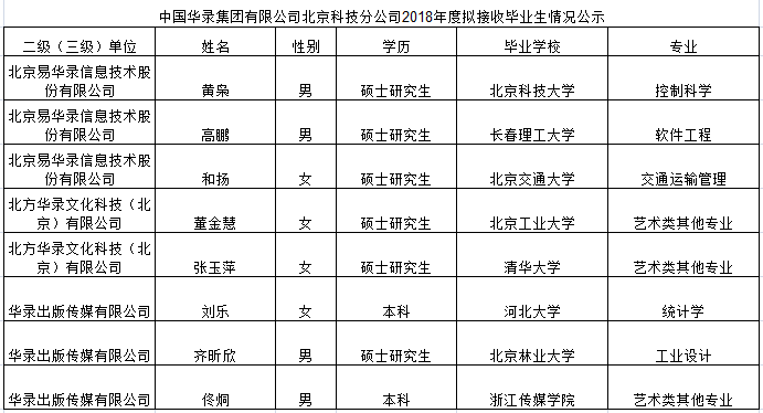 為確保中國華錄集團(tuán)有限公司在京單位高校畢業(yè)生接收工作規(guī)范有序開展,現(xiàn)將在京單位提交的高校畢業(yè)生接收情況發(fā)布公示,接受社會監(jiān)督。公示期2018年9月21日-2018年9月30日。